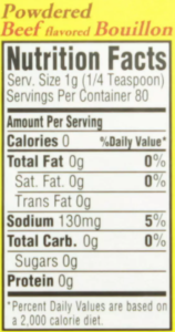 INGREDIENTS:  Salt, Hydrolyzed Soy Protein, Sugar, Monosodium Glutamate, Yeast Extract, Dehydrated Onion, Beef Fat, Silica (Anticaking Agent), Spices Caramel Color, Disodium Inosinate And Disodium Guanylate, Annato Color.