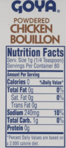 INGREDIENTS: Salt, Monosodium Glutamate, Sugar, Hydrolyzed Soy Protein, Malto Dextrin, Dehydrated Vegetables (Onion, Garlic, Celery And Parsley), Yeast Extract, Chicken Fat, Turmeric, Chicken Meat, Caramel Color, Natural Flavor, Disodium Inosinate And Guanylate, Silica (Anti-caking Agent).