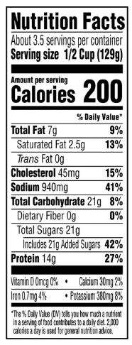 INGREDIENTS:  Fully Cooked Ingredients: Cooked Seasoned Pork (Pork, Water, Hydrolyzed Soy Protein, Salt, Sodium Phosphates), Tomato Puree (Water, Tomato Paste), High Fructose Corn Syrup, Vinegar, Brown Sugar, Contains 2% or less of Molasses, Modified Cornstarch, Salt, Caramel Color, Paprika, Spices, Natural Smoke Flavoring, Propionic Acid, Cultured Dextrose, Flavoring, Potassium Sorbate (Preservative), Sodium Diacetate, Sodium Benzoate, Yeast Extract, Maltodextrin, Erythorbic Acid (To Maintain Color), Nisin Preparation (Salt, Nisin), Tamarind Extract (Contains Corn Syrup, Prune Juice Concentrate, Extract of Tamarind, Water, Tartaric Acid, Caramel Color, Citric Acid, Molasses). Contains: Soy.