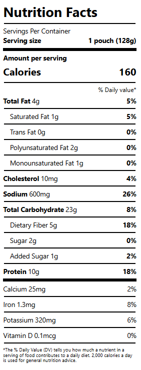 Light Tuna, Water, Cooked Quinoa (Water, Red and White Quinoa), Cooked Brown Rice (Brown Rice, Water), Cooked White Beans (White Beans, Water), Sweet Corn, Carrots, Red Bell Pepper, Sunflower Oil, Contains 2% or Less of the Following: Garlic Puree, Onion Puree, Salt, Lime Juice, Garlic, Orange Juice, Cilantro, Sugar, Spices, Chili Pepper, Jalapeno Puree, Onion Powder, Vinegar, Citric Acid, Malic Acid, Modified Food Starch [Corn], Yeast Extract, Xanthan Gum, Natural Flavors, Caramel Color, Extractives of Paprika (Color), Beet Powder (Color), Tapioca Food Starch, Citrus Fiber.