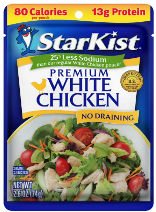 INGREDIENTS: Chicken (White Chicken Meat, Water, Modified Food Starch [Corn], Salt, Sodium Phosphate) Weight 2.6 oz Reviews There are no reviews yet. Be the first to review “STARKIST WHITE CHICKEN 25% LESS SODIUM 2.6oz”Cancel ReplyYour email address will not be published. Required fields are marked *Your rating * Rate… Perfect Good Average Not that bad Very poor Name *Email *Your review * Save my name, email, and website in this browser for the next time I comment. Submit Δ